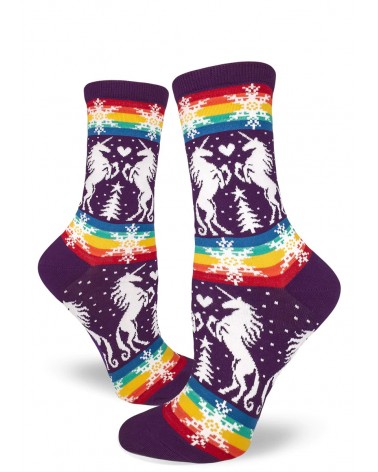 Willst du die Weihnachtszeit fröhlicher gestalten? Dann zieh dir diese verrückten Weihnachtssocken "Gay Apparel" an! Das traditionelle Weihnachtspullimuster wurde auf den Kopf gestellt, mit Einhörnern statt Rentieren, Schneeflocken, Herzen und Weihnachtsbäumen, alles auf einem regenbogenfarbenen Hintergrund.