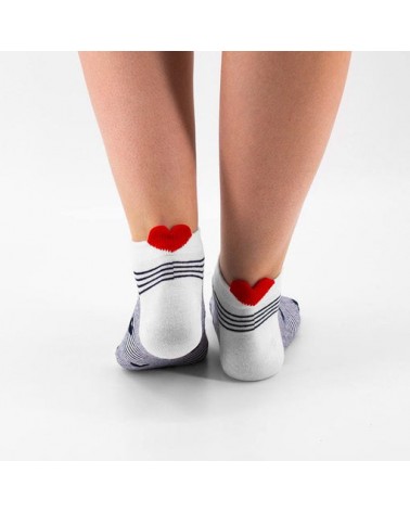 Mit unseren Shorty-Socken "Coup Coeur" aus Frankreich zeigst du deine Liebe zum Detail. Wenn du dazu Schuhe trägst, sind nur die süssen Herzchen zu sehen, und ohne Schuhe stichst du mit den Herzchen auf Streifen farbenfroh aus der grauen Sockenmasse heraus.