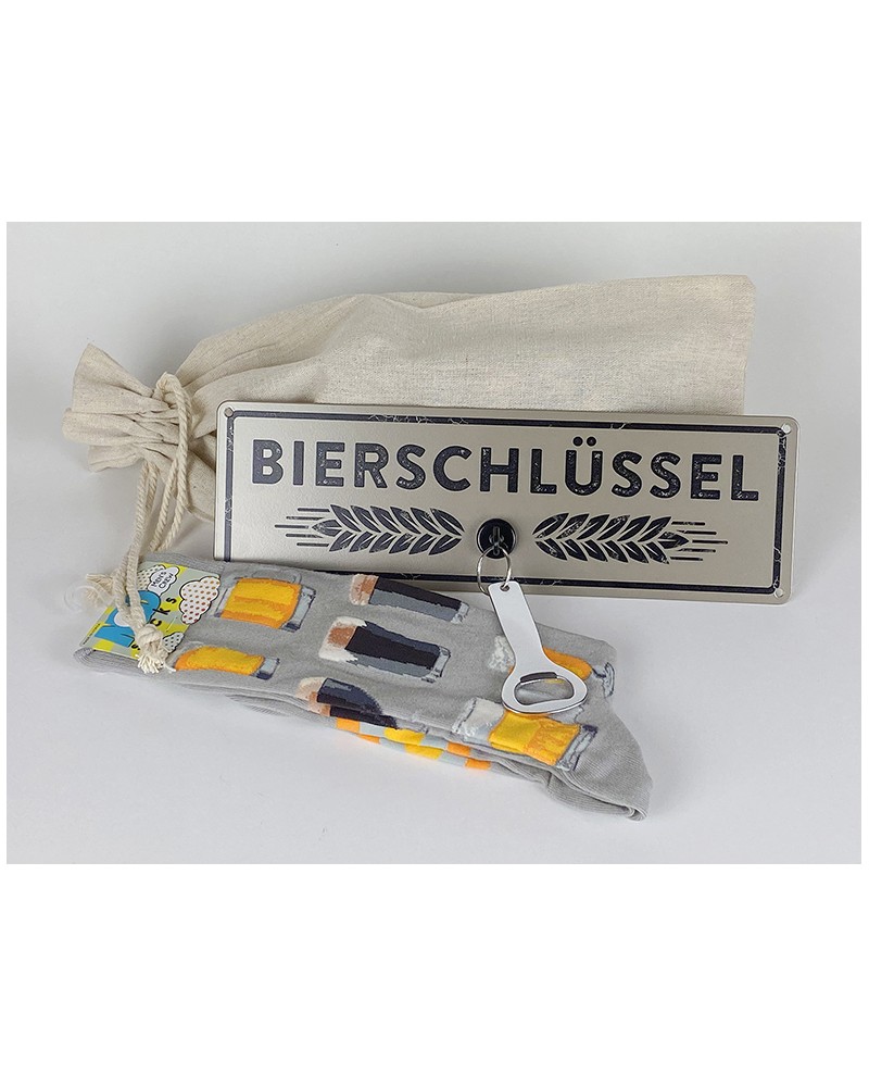 Es beinhaltet ein hochwertiges, grosses Metallschild mit Flaschenöffner mit der Aufschrift "Bierschlüssel" sowie unsere Herren-Socken "Craft Beer". Und damit dein Geschenk schon fix-fertig bei dir ankommt, verpacken wir alles in einem natürlichen Leinensäckchen (Farbe Natur).