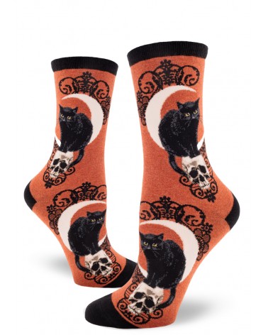 Eine wahrlich mystische Gemeinschaft von Mond, Totenkopf und schwarzer Katze. Wenn du auf Gothic oder Halloween stehst, dann sind die Socken "Black Cat Moon" genau die Richtigen an deinen Füssen.