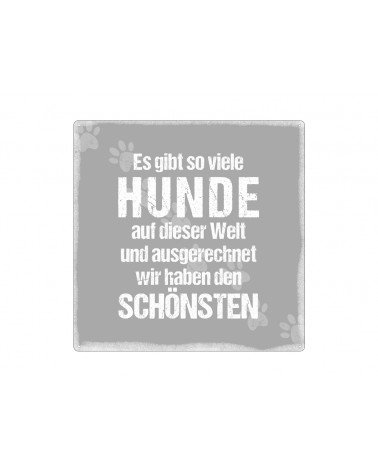 Es beinhaltet ein hochwertiges, grosses Metallschild mit der Aufschrift "Es gibt so viele Hunde auf dieser Welt und ausgerechnet wir haben den Schönsten". Das Metallschild ist 20 x 20 cm gross und wird von Hand in Deutschland gefertigt. Es besteht aus besonders dickem Metall, ist rundum lackiert und hat an den Ecken Aufhängebohrungen. Da es wetterfest ist, kannst du es sogar Outdoor anbringen.
