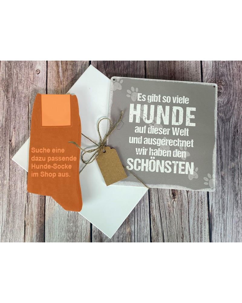 Im Set mit dabei sind: ein hochwertiges Metallschild, hübsch verpackt in einer weissen Schachtel. Es sind keine Socken darin enthalten! Bestelle separat dazu eine passende Hunde-Socke. –> Hier geht’s zu den Damen- und Herren-Hunde-Socken.