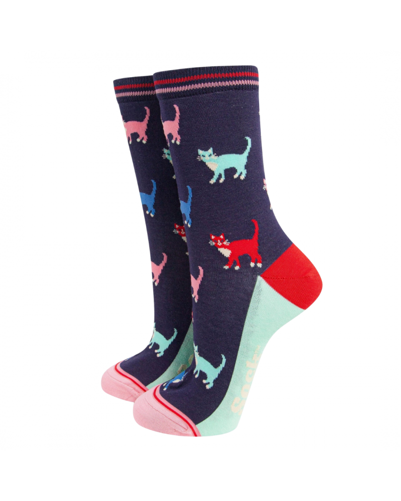 Süss und bunt. Passend für alle die es bunt und fröhlich mögen, passen die Socken" Lots of Cats" perfekt. Abgeschlossen mit einem klassischen gestreiften Bündchen für eine bequeme Passform.