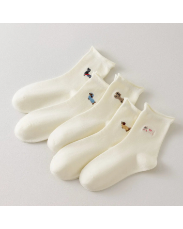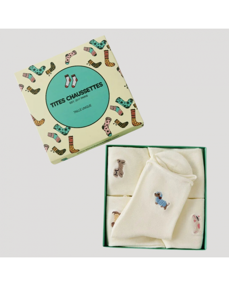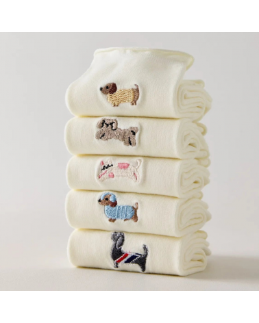 Diese cremefarbenen Damen Socken "Petit Chien" mit Rollbündchen wirken besonders feminin. Dank ihrer bequemen Passform sorgen für einen lässigen und individuellen Look.