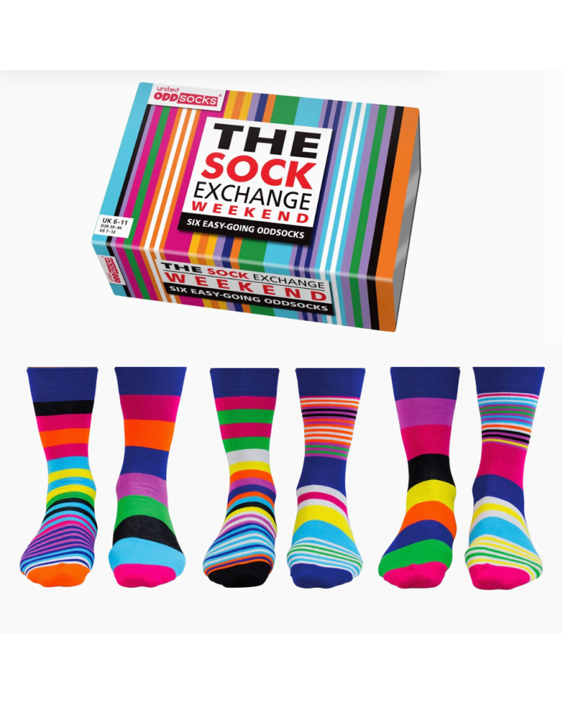 Die Unisex-Geschenk-Box „Exchange W.end“ bringt Farbe, Humor und gute Vibes in jede Sockenschublade. Sechs verschiedene Streifen-Designs, null Langeweile und maximaler Spass beim Kombinieren – perfekt für alle, die Basics lieber laut statt langweilig tragen.