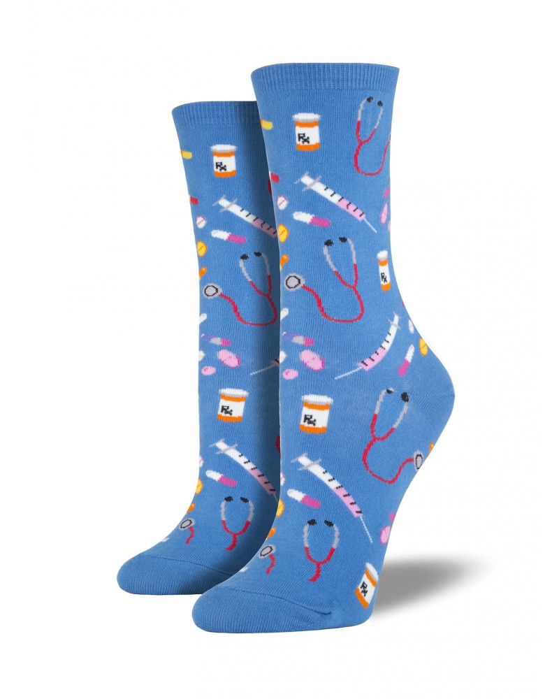 Vorbei ist die Zeit, in der sich Ärztinnen und Krankenschwestern im Krankenhaus oder der Praxis nur in langweiligem Weiss zeigen dürfen. Wenigstens an den Füssen sollte medizinisches Fachpersonal auch auf schicke Kleidung achten dürfen. Unsere Arzt-, Mediziner und Krankenschwester-Socken "Meds" passen immer.