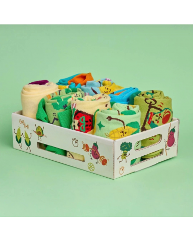 Die Damen-Geschenk-Box „Fruit & Vegetables“ liefert dir 8 Paar Socken voller Frucht- und Gemüse-Power – bunt, frech und garantiert kalorienfrei.
