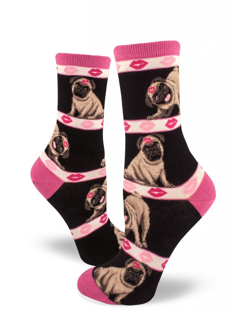 Wie sehr liebst du deinen Mops? Wenn dein Vierbeiner genauso von Küssen übersäht ist wie dieser Mops, dann gehören die schicken Socken "Pugs & Kisses" unbedingt an deine Füsse.